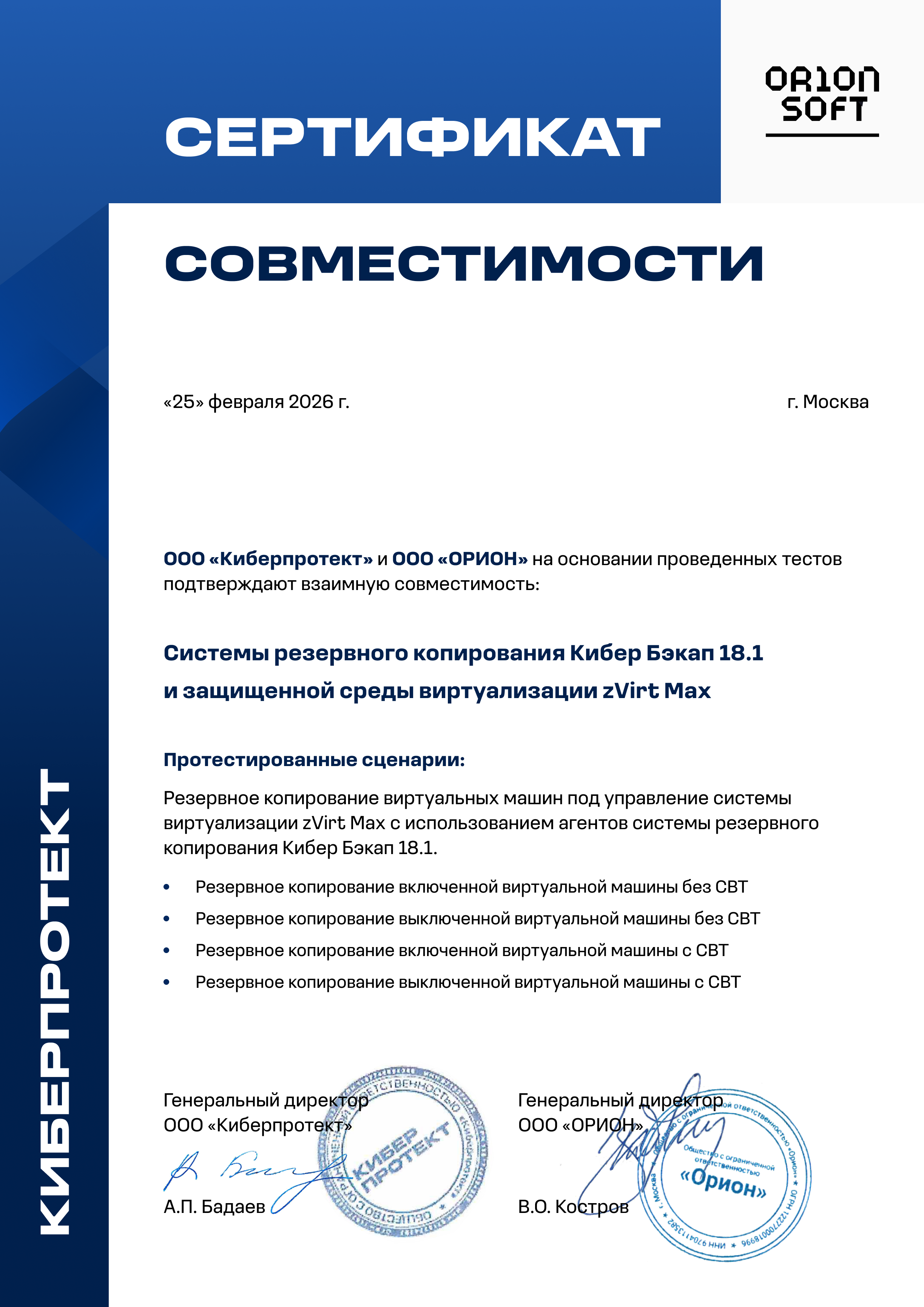 Совместимость системы резервного копирования Кибер Бэкап 17.1 и защищенной среды виртуализации zVirt Max обеспечивает надежное резервное копирование виртуальных машин под управлением zVirt Max с использованием агентов Кибер Бэкапа 17.1, а также восстановление виртуальных машин из резервных копий.